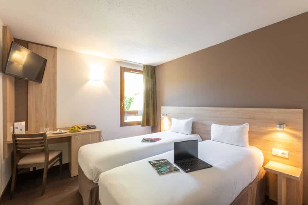 Deux Lits 80x200 cm. Douche et WC, Sèche Cheveux à disposition à la réception. Téléviseur Ecran Plat. Wifi Gratuit Haut débit. Parking Gratuit sous vidéo surveillance. Piscine accessible aux beaux jours. OFFRE INCLUANT 2 PETITS DEJEUNERS